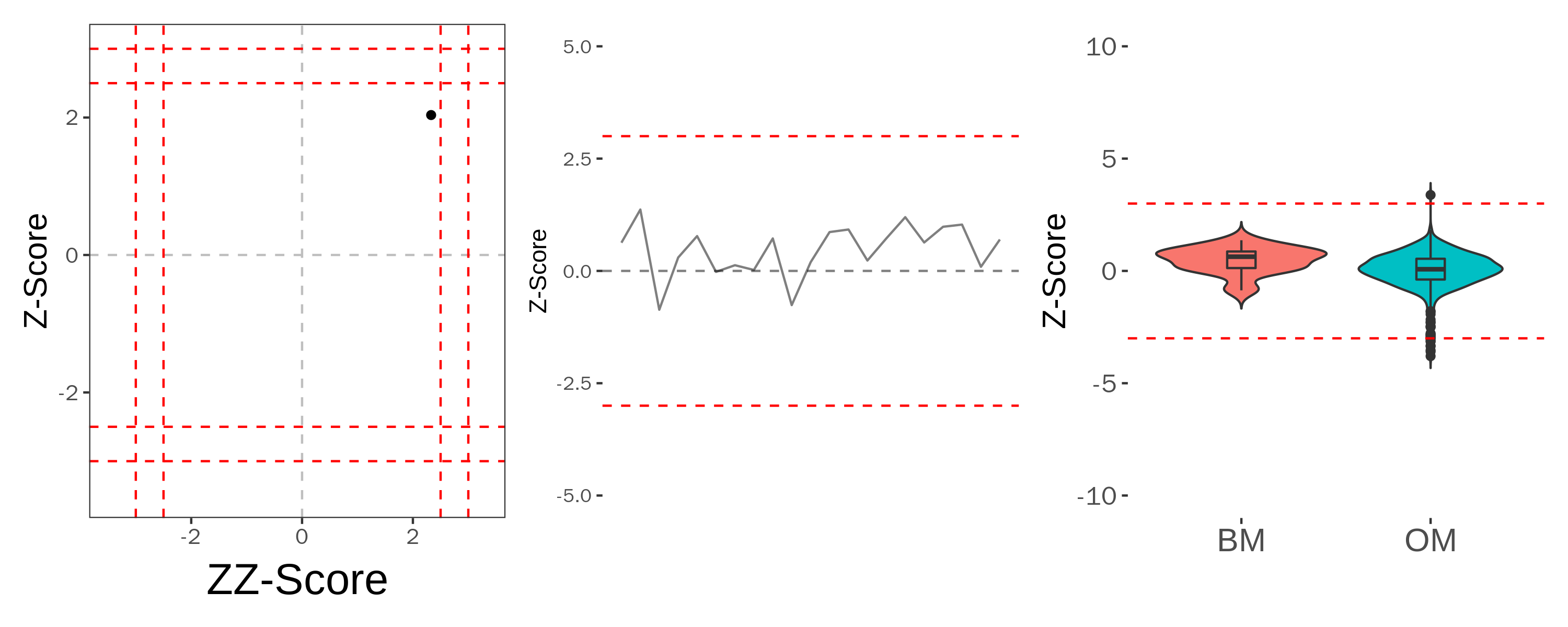 下图左图说明样本某染色体的z值、zz值都小于2.5,都在正常范围,不在临界值范围(2.5-3),也不在异常范围(>3)。下图中图说明染色体局部区域z值都在正常范围,存在局部 CNV 的可能性较小。下图右图说明BM、OM分布接近,染色体与其余染色体的bin z 值分布无明显差异。