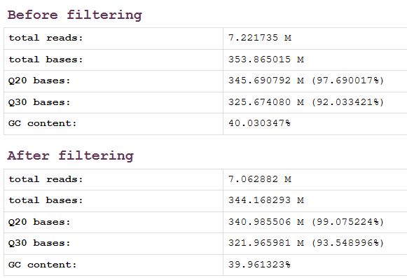 去除序列接头、去除polyX、低质量碱基、含N序列、低质量序列、过短序列,给出通过质控后的数据统计。