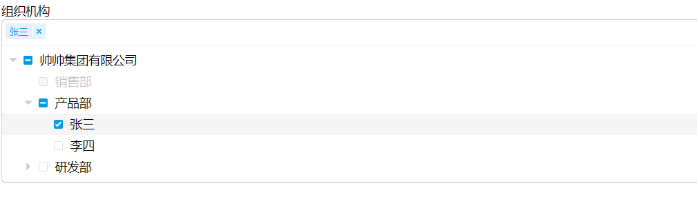 [{"children": [{"id": 602,"label": "销售部","isDisabled": true}, {"children": [{"id": 1851,"label": "张三"}, {"id": 1852,"label": "李四"}],"id": 603,"label": "产品部"}, {"children": [{"id": 1854,"label": "李小萌"}],"id": 611,"label": "研发部"}],"id": 1,"label": "帅帅集团有限公司"