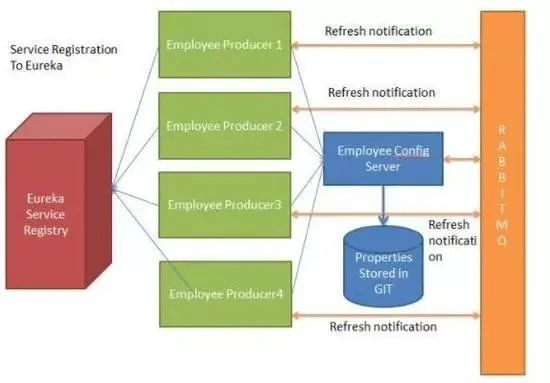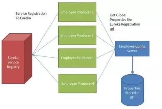 下面的例子中多个员工生产者模块从 Employee Config Module 获取 Eureka 注册的财产。