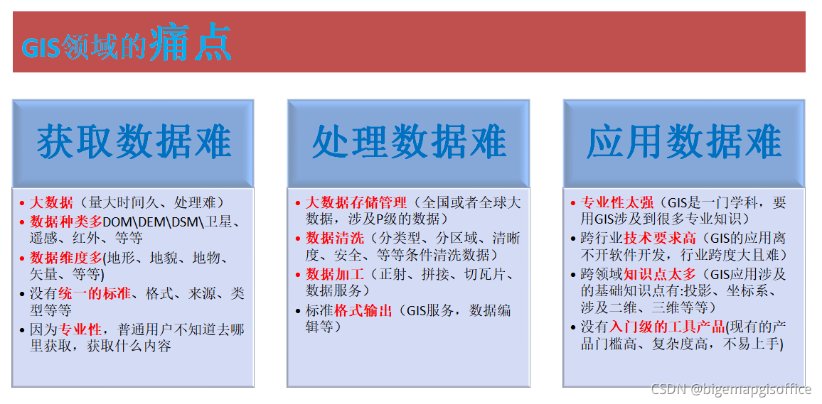 Bigemap用十年时间,专注于GIS领域技术创新和应用创新,建立起了GIS大数据中心,推出了GIS行业的核心产品(一心三端)