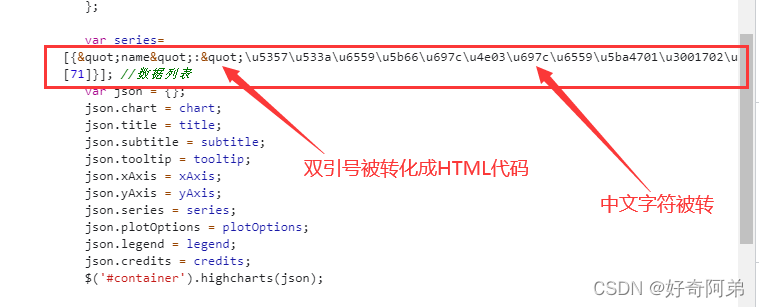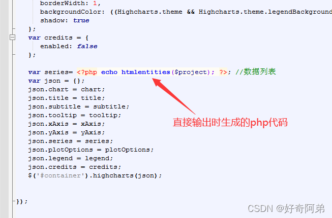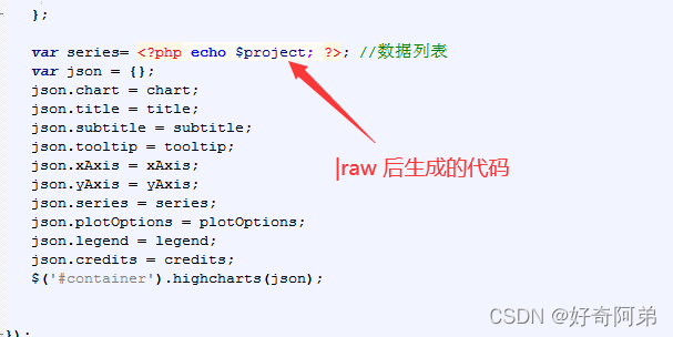 var series= {$project}; //数据列表,主要是这一项是后台传入的json数据var json = {}; json.chart = chart; json.title = title; json.subtitle = subtitle; json.tooltip = tooltip;