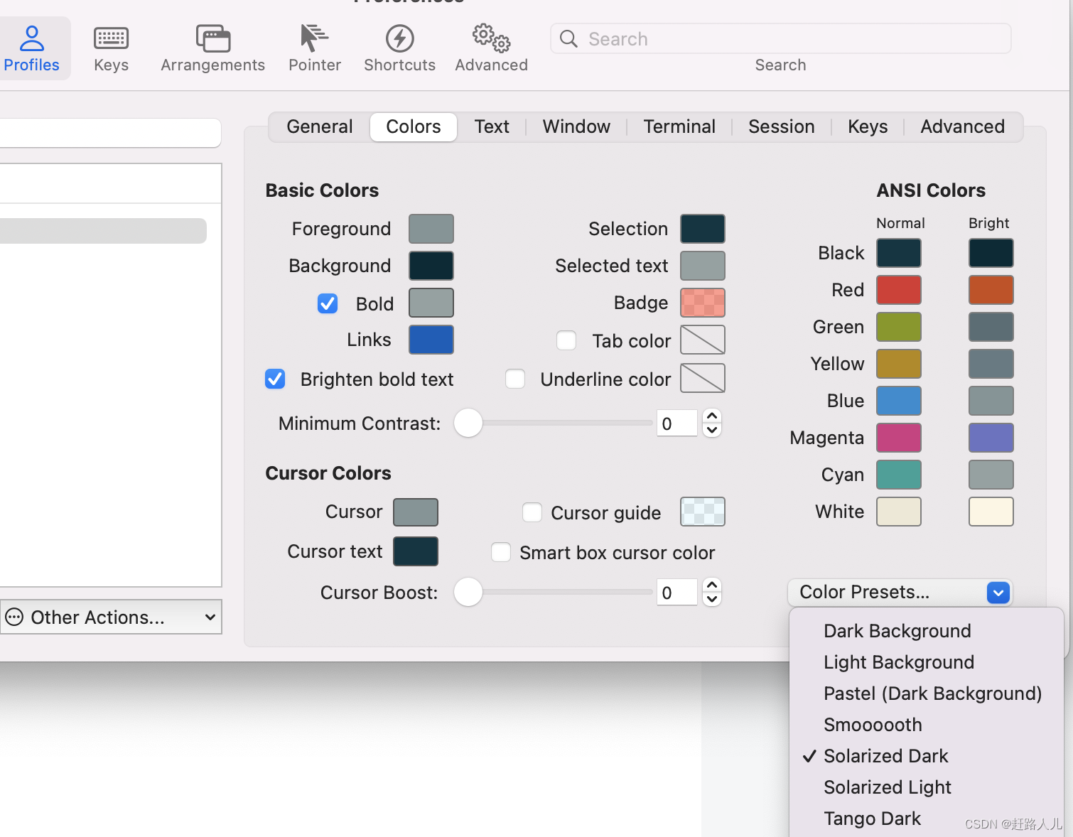 Preferences > Profiles > Colors > Color Presets > 选择Solarized Dark (这个是哑光淡蓝色,在很多支持配色的软件里都有,是一个经典配色了)