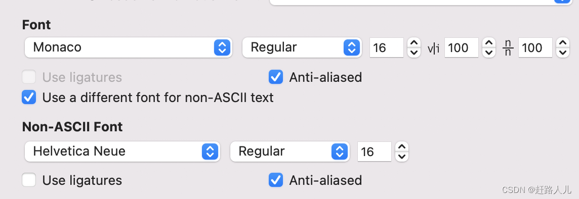 Preferens > Profiles > Text > 勾上Use a different font for non-ASCII text > 选择自己喜欢的字体。iterm的默认字体是Monaco,Monaco的英文显示不错,但是对于中文支持不好(如果将字体放大,中文看起来比英文还小)。