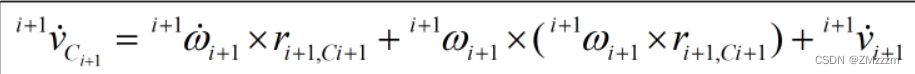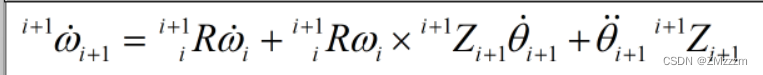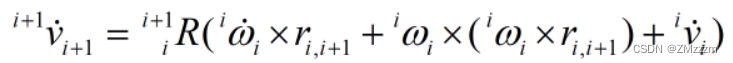 2、正运动学递推角速度,角加速度,线加速度,质心加速度。由于基座是固定的所以基座的角速度由基座向末端各连杆递推角速度: