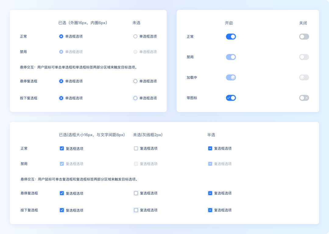 单选/复选/开关在原有基础上大加圆角,提高组件精细化和精美观度,更加明确交互效果。