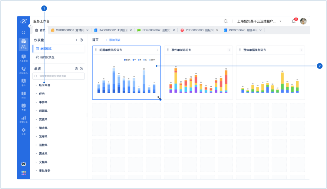 2. 仪表盘可以选择不同的图标类型、数据源、配色方案进行图表定义,组合成用户实际业务场景。每个业务场景下的图表类不仅有可视化的统计图展示,还可以通过拖拽图表,控制其在页面展示的位置和大小比例,自定义个性化仪表盘。