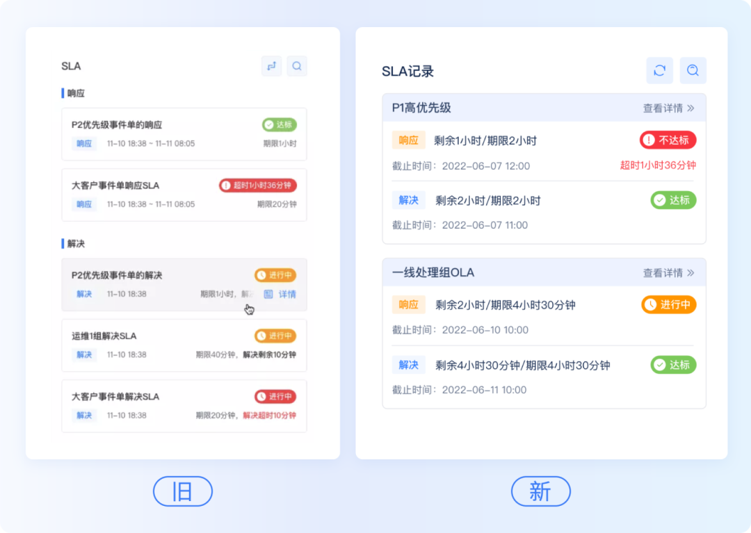 示例二:SLA组件重构,把同一类型的解决和响应重组,增加空间使用率,减轻视觉压力,同时在交互上取消了hover显示详情按钮,直接把详情按钮展示出来,简化用户认知与操作负荷。
