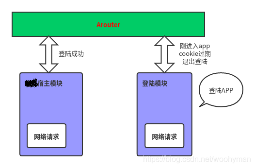 在宿主模块的登陆成功后所要跳转的界面上加上登陆成功的注解,在登陆模块调用navigation()即可实现从登陆模块到某模块的跳转。某模块到登陆模块的跳转也是同样的道理。同时网络请求是作为一个依赖库的形式被某模块调用,所以我们可以直接在网络请求中拦截cookie并检测出过期轧出跳转请求,同样也是可以方便地跳转至登陆模块。