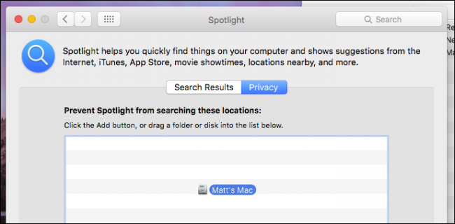 In the Spotlight preferences, click on the “Privacy” tab. You may already have items here, but as you see in the following screenshot, ours is empty. Now, drag your hard drive onto the Privacy window.
