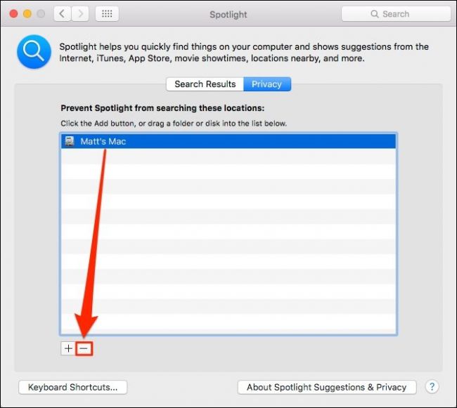 Now that your system drive is added to Spotlight’s Privacy window, it won’t be allowed to show you results from it and should remove them from the index. The next thing you then need to do is click the “-” at the bottom of the Privacy tab.