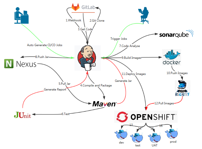 下图是我们目前建设的针对于容器云平台下的微服务应用的CICD全流程流水线的示意图。