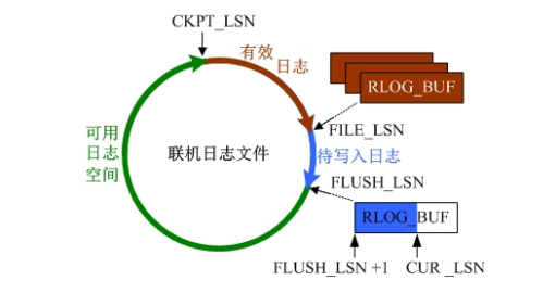 在联机日志文件中,可以覆盖写入redo日志的文件长度为可用日志空间;不能被覆盖的redo日志,系统故障重启时需要重做的redo日志为有效日志,有效日志的lsn取值范围为(CKPT_LSN,FILE_LSN]。数据库运行过程中产生的待写入日志首先写入日志缓冲区RLOG_BUF,当日志刷盘时一起写入联机日志文件中。