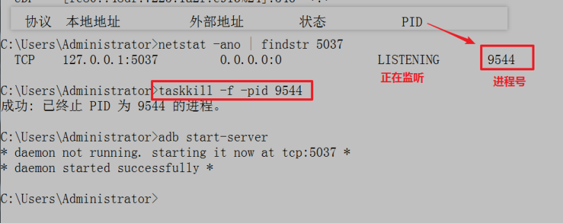 如果TCP:5037端口被其他进程占用导致adb服务启动失败,杀死该进程即可---->终极方法重启模拟器/电脑即可。查找占用的进程号:netstat -ano | findstr 5037 杀死该进程:taskkill -f -pid XXX