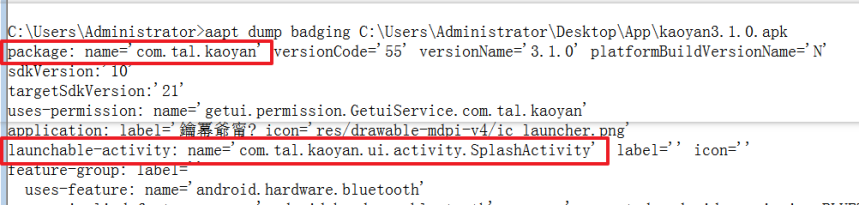 package aapt dump badging XXX.apk可以把apk转换成二进制文本打印在DOS窗口