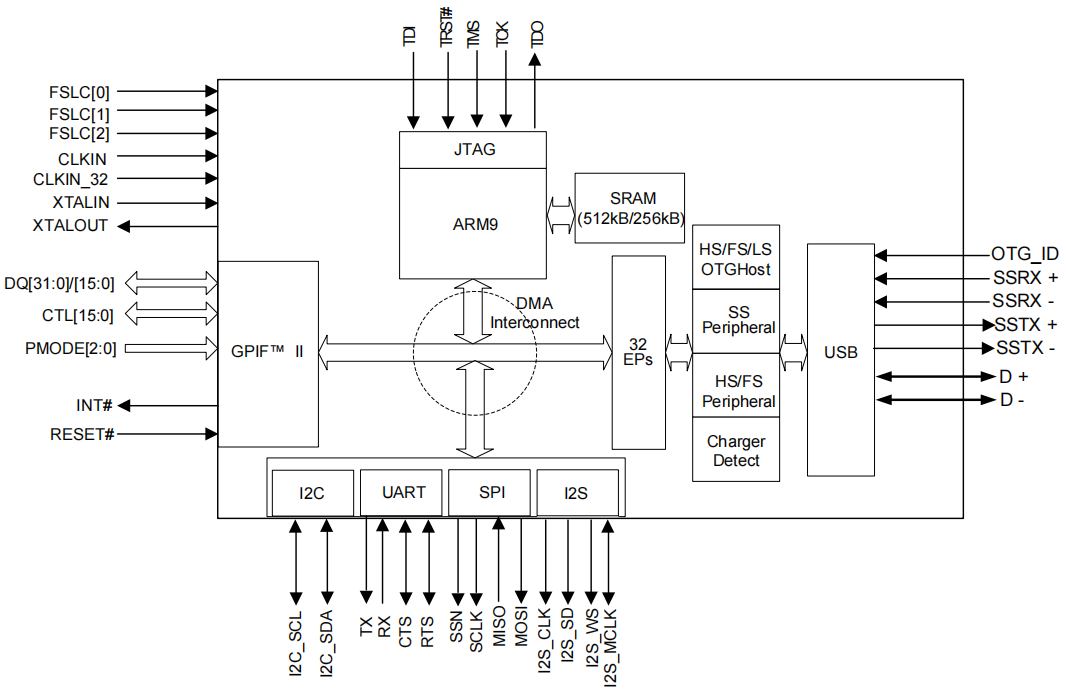 支持I2C、UART、SPI、I2S等,其中如果使用复用D+/D-引脚做为Carkit uart接口使用,此时用GPIF II接口则在48、49GPIO引脚上。但速率最大只能到9600bps。支持工作频率33 MHz做SPI master,仅支持single-master 。UART使用Rx、Tx、CTS、RTS引脚,速率范围300 bps 到 4608 Kbps。I2C只支持master模式,支持multi-master。