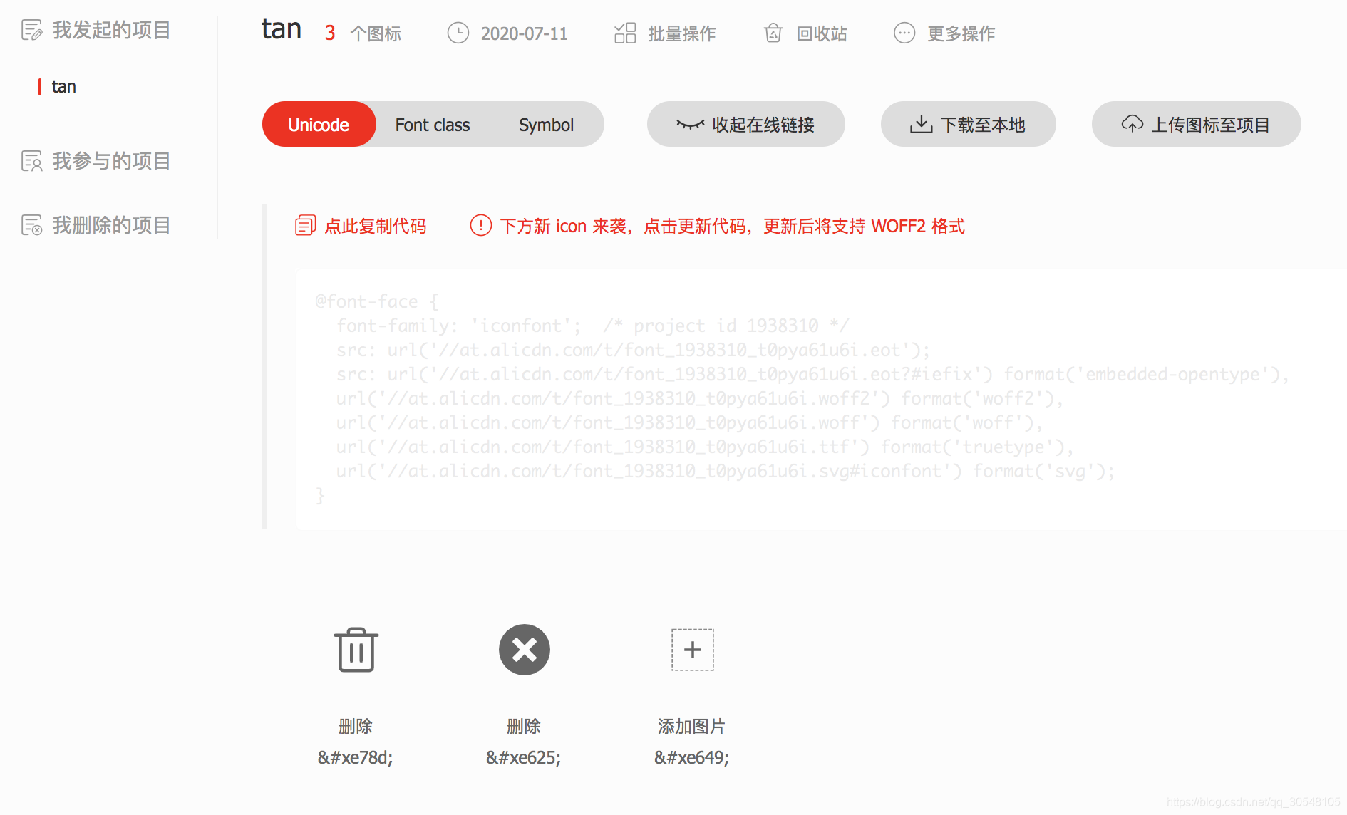 然后选择上方的 “图标管理” -> “我的项目”