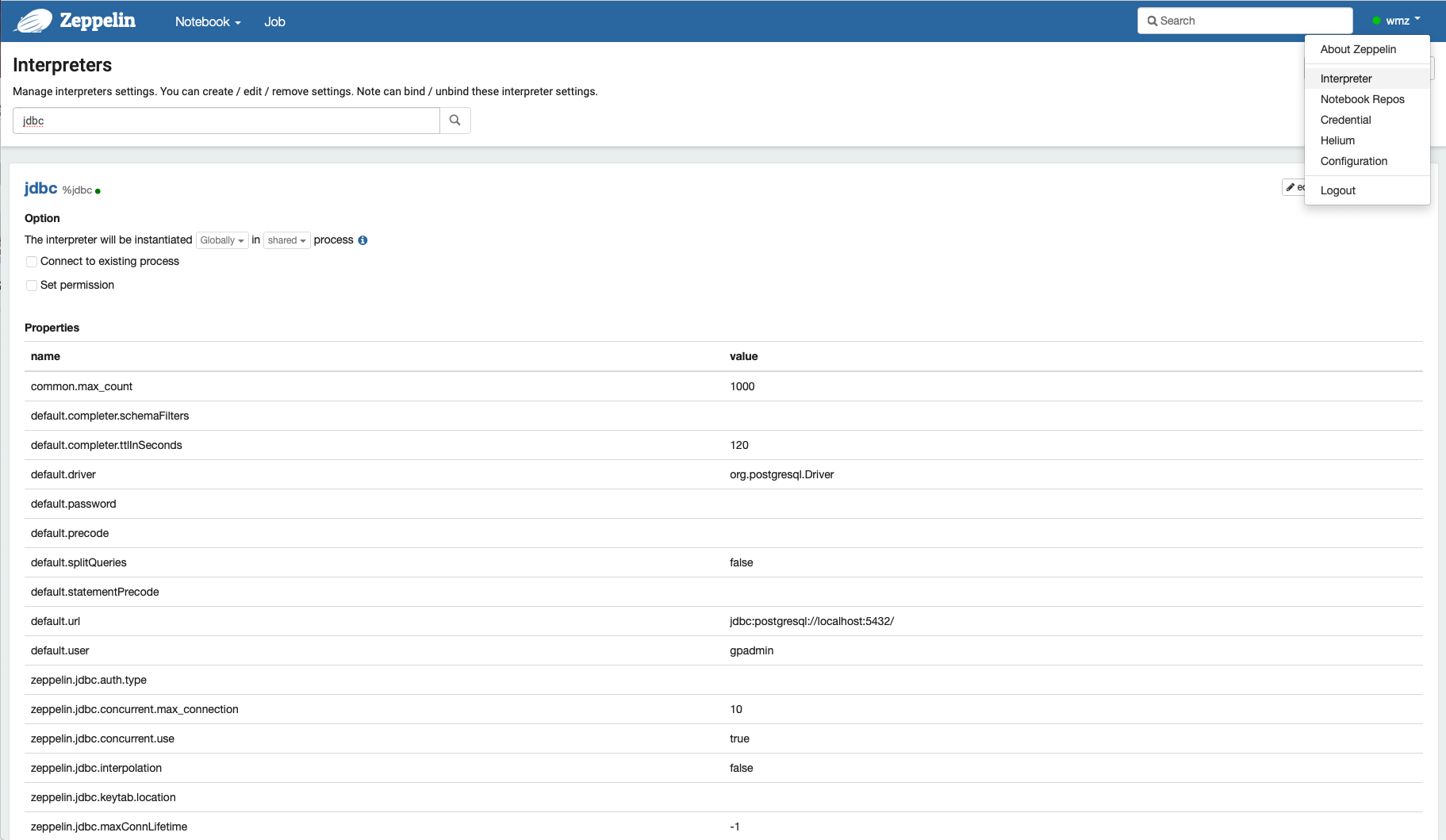点击右上角的下拉菜单可以进入Interpreter界面,在该界面可以创建解释器。或者修改已有解释器的设置,以jdbc为例,在jdbc解释器页面可以修改一些jdbc参数