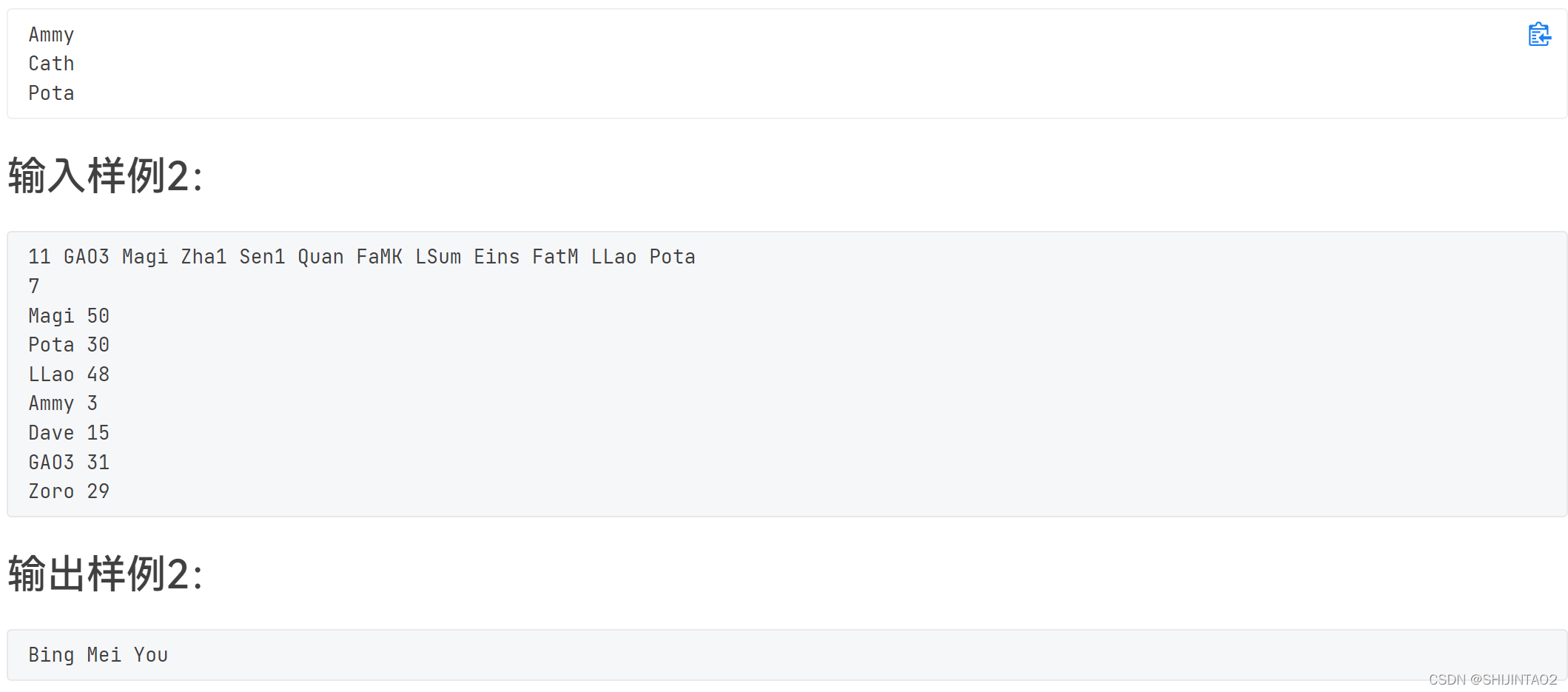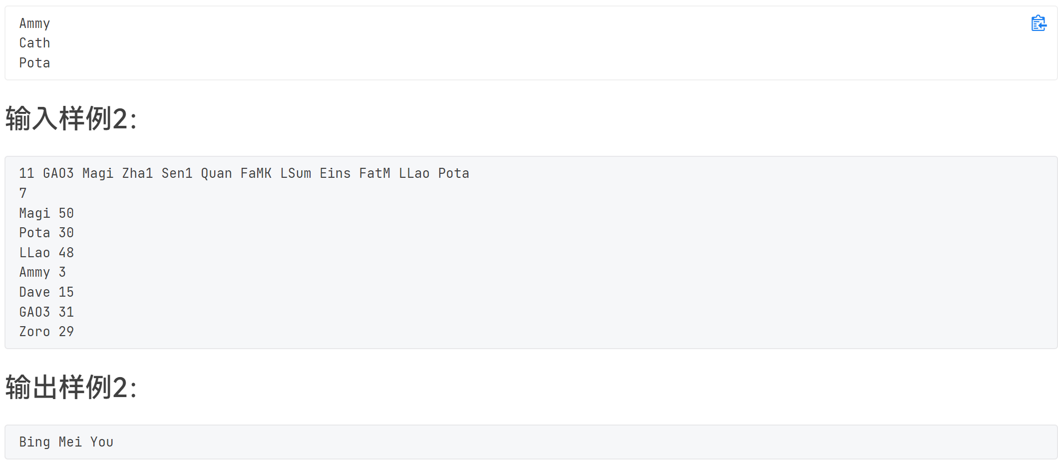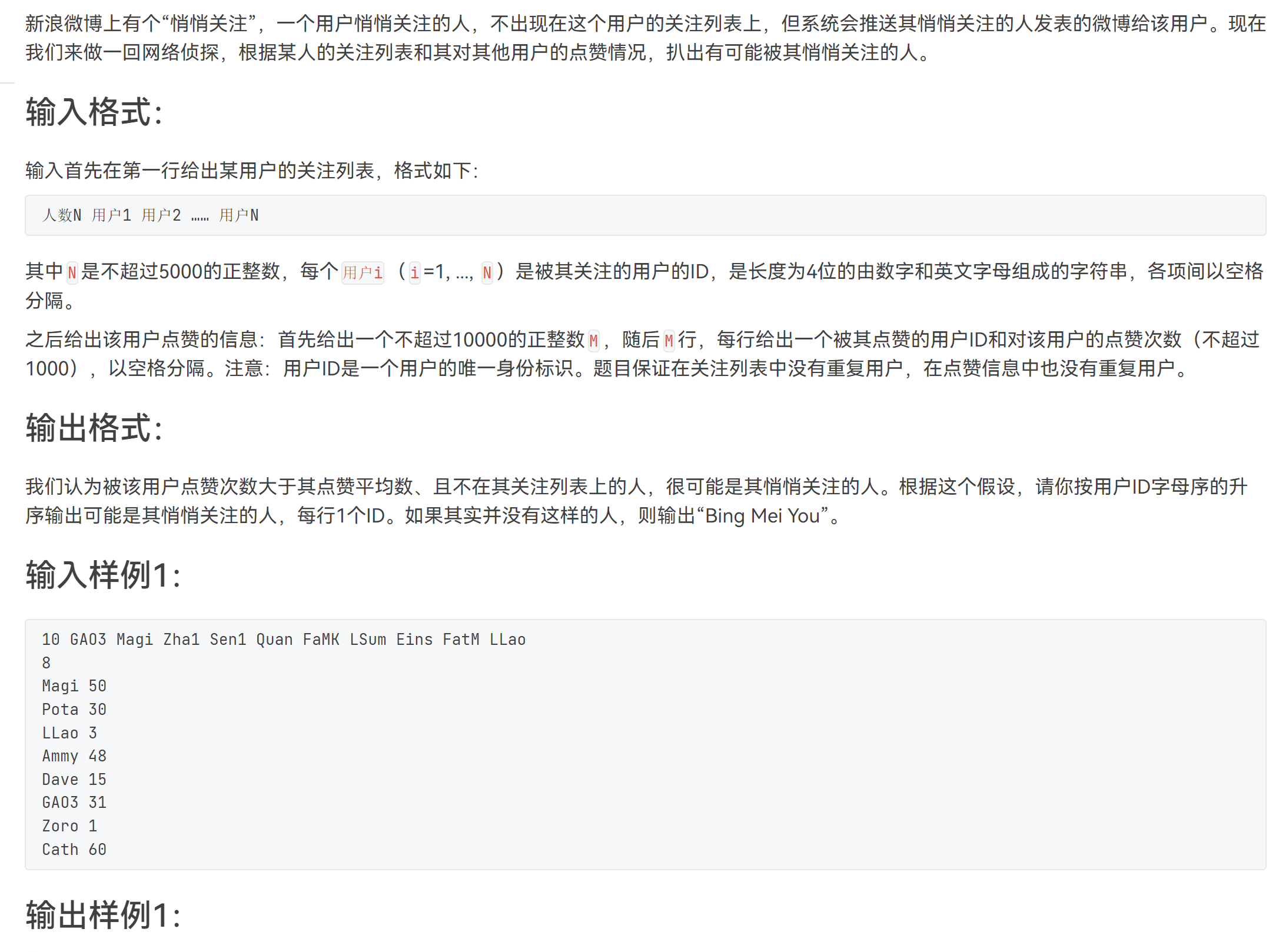 {cin>>n;for(int i=0;i>s;a[s]=1;}cin>>m;for(int i=0;i>b[i].t>>b[i].num;sum+=b[i].num;}aver=1.0*sum/m;for(int i=0;iaver&&a[b[i].t]==0){d.push_back(b[i].t);//将符合条件的数据存储到vector中flag=1;}}sort(d.begin(),d.end());if(flag){for(vector::iterator i=d.begin();i!=d.end();i++)//输出vector容器中的内容,一定要定义迭代器cout<<*i<