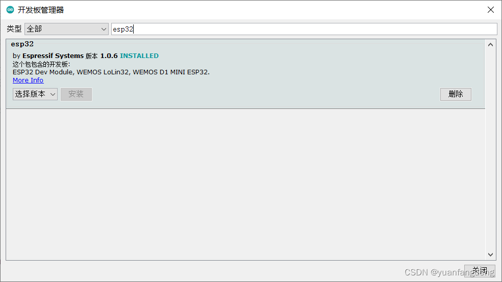 步骤二:【工具】->【开发板】->【开发板管理器】搜索esp32,然后安装