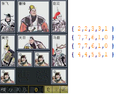 我们可以把这个图看成一个4*5的二维数组,用不同数字代表不同的角色。这里我用0代表空位,1代表小兵,23456分别表示张飞黄忠赵云马超关羽这四个武将,7代表曹操,那么整个图的信息就表示为右图中的数组了,注意右图中的一行是左图中的一列,所以看着是翻转过。
