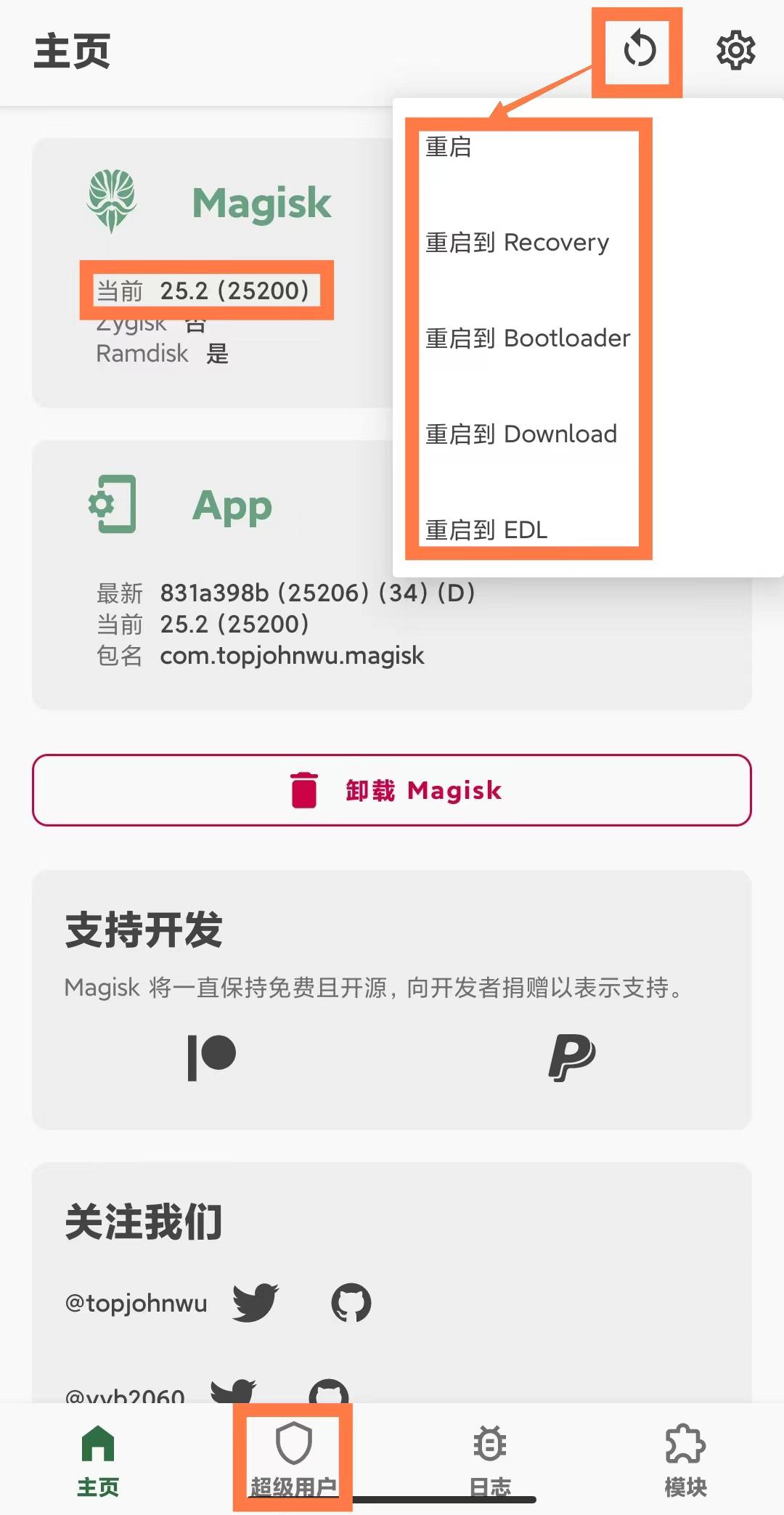 在magisk管理端首页查看是否能显示当前magisk版本;在右上角圆形箭头处,检查是否能控制手机重启到不同模式;检查是否能点开“超级用户”菜单。