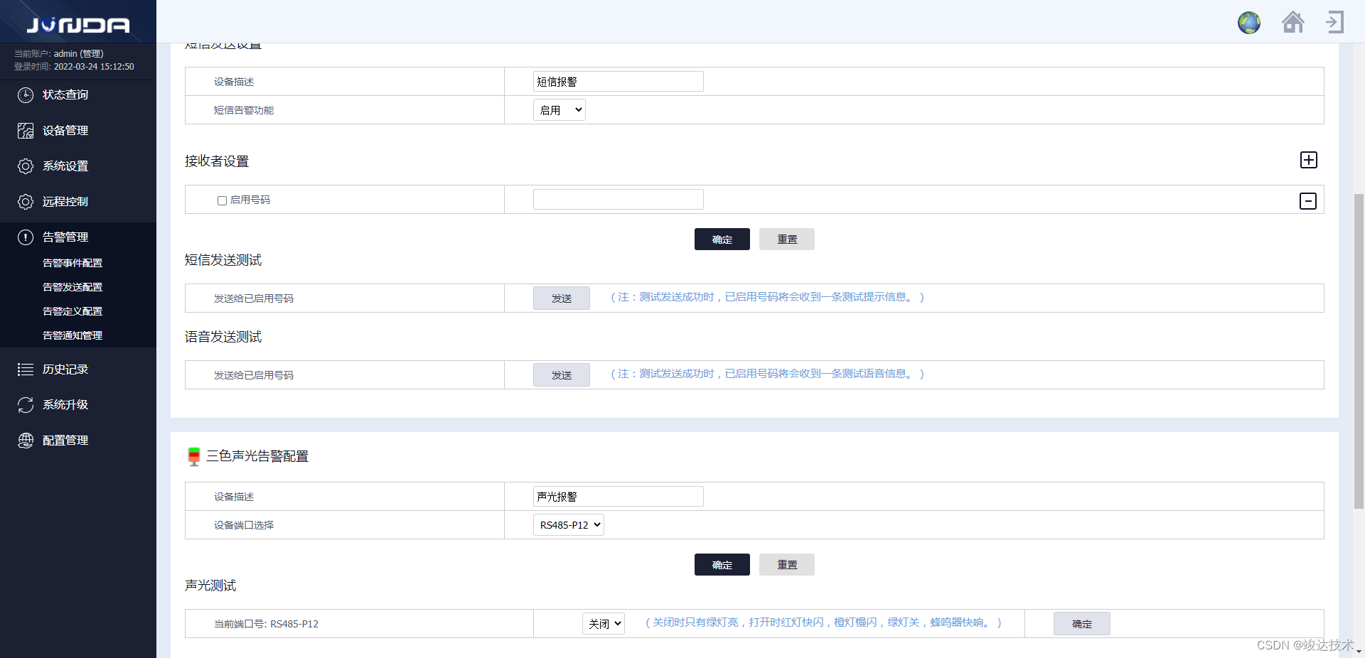15)支持短信、语音告警和声光告警,可手动停止当前的声光告警,以此关停声光后,当有新的告警产生时会重新触发声光告警