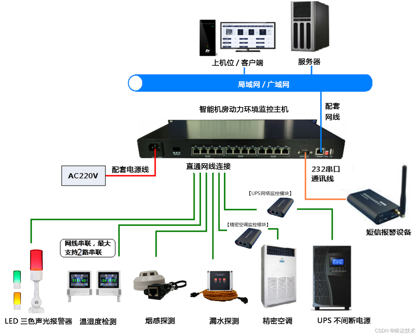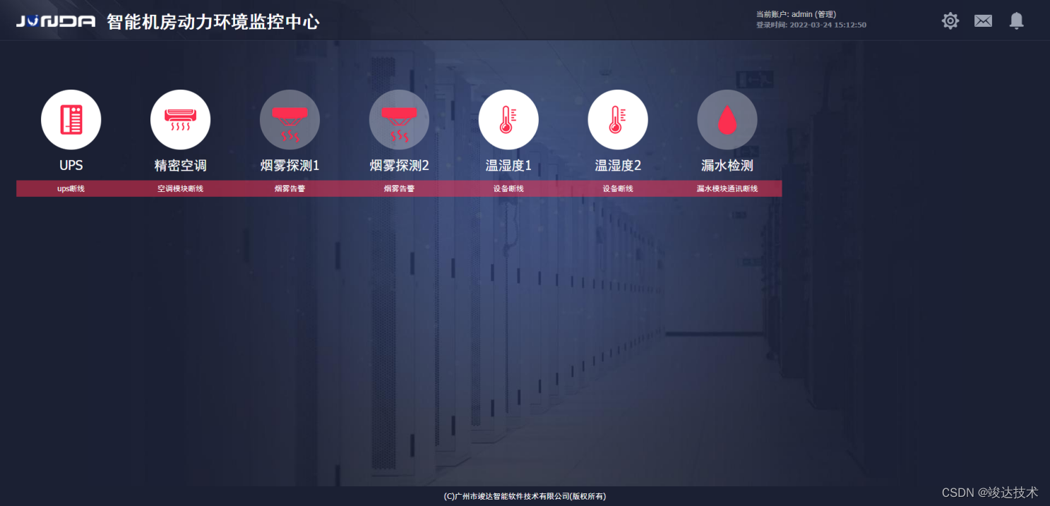 监控内容涵盖:UPS、温湿度、精密空调、烟感、漏水等,实现了集中实时监控、远程运行管理、故障预警通知、历史数据查询、机房无人值守。而且安装简单,操作便捷,只需要简单的网络常识和接线操作即可进行安装实施,是中小型机房动环监控的首选。