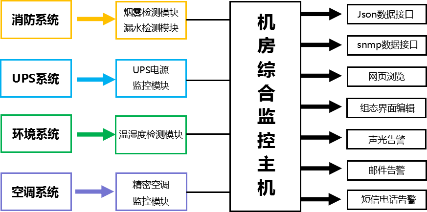 通过该方案可实现消防、UPS、环境和空调这4大系统的统一检测,在检测到系统异常时,能够进行声光、短信、电话、邮件等告警并且能够提供Json、SNMP、modbusTCP等数据接口接入各类不同的动环监控系统,机房综合监控主机为嵌入式WEB服务方式,B/S的 系统架构,用户可以通过网页浏览设备的实时运行状态!