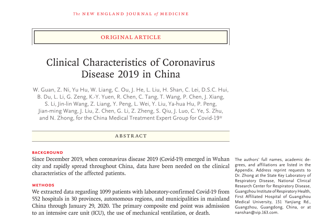 同样是2020年发表在NEW ENGLAND JOURNAL OF MEDICINE杂志上题为“Clinical Characteristics of Coronavirus Disease 2019 in China”的研究论文,论文2023年影响因子高达158.5分。