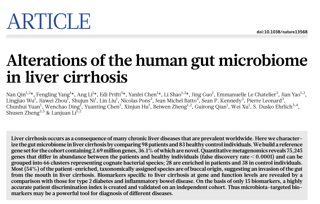 2014年发表在Nature杂志上面的题为“Alterations of the human gut microbiome in liver cirrhosis”的论文,作者通过比较98名患者和83名健康对照组的肠道微生物群来描述肝硬变患者的肠道微生物群,发现以微生物区系为靶标的生物标志物可能是诊断不同疾病的有力工具。