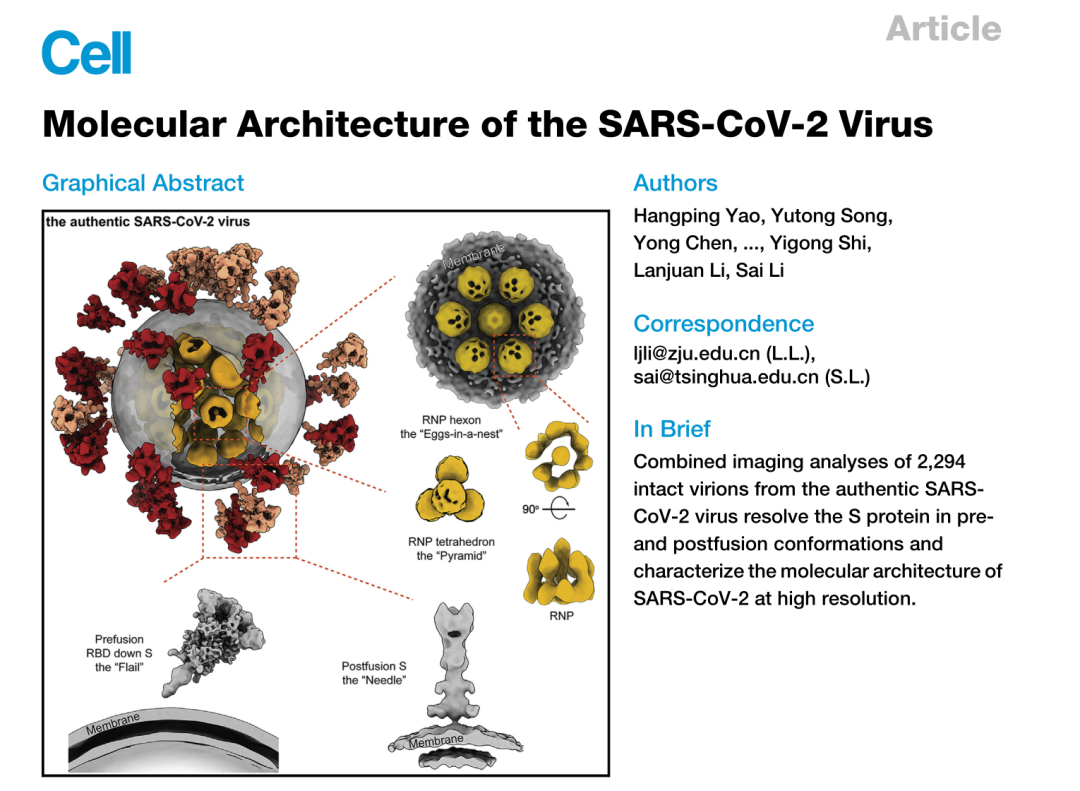 2020年发表在Cell杂志上的题为“Molecular Architecture of the SARS-CoV-2 Virus”的论文,研究结果非常详细地揭示了SARS-CoV-2病毒的结构,并阐明了该病毒如何将其30kb长的单节段RNA包装在直径约80 nm的管腔中。