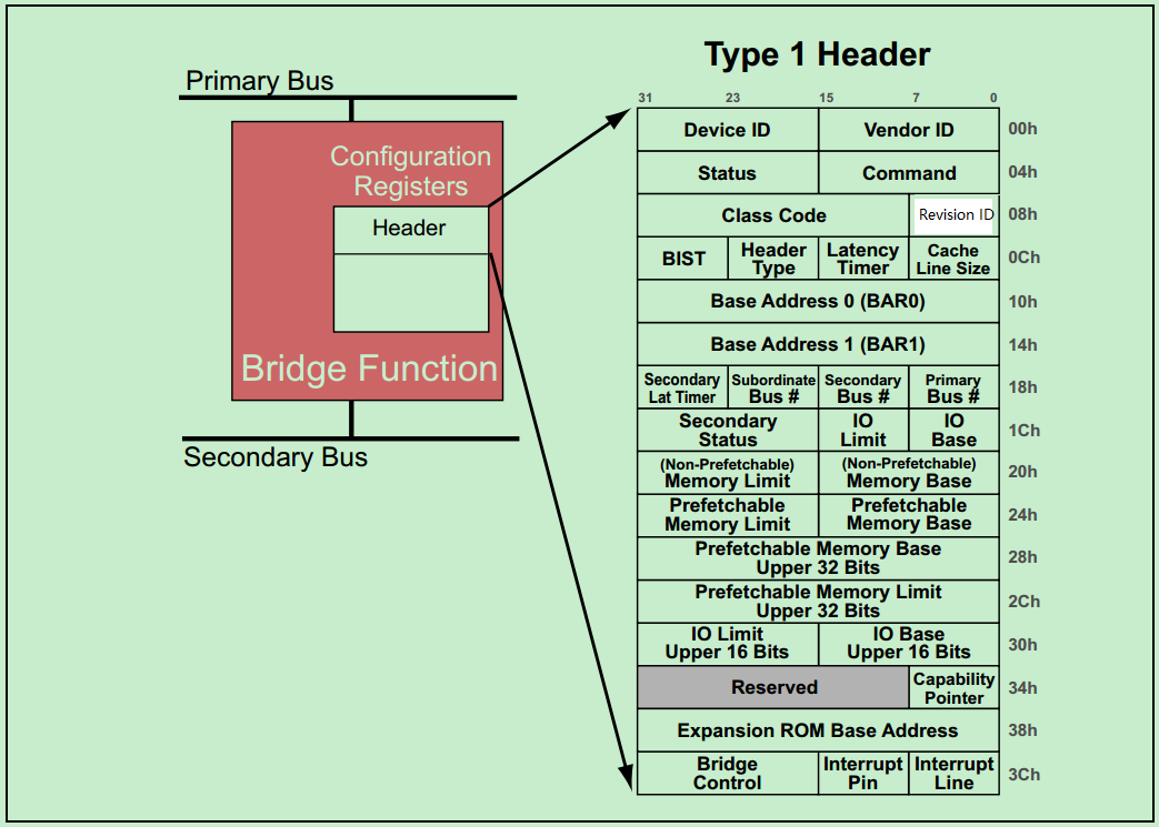 下面两种类型的寄存器都是PCI桥设备用来判断是否将总线事务传递到桥的另一边时使用的。