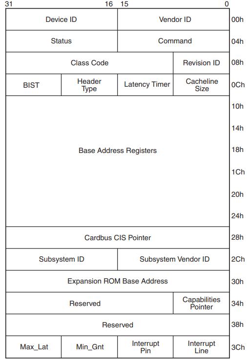 在这之后,操作系统就会去进一步地识别这是个什么具体设备,有4个寄存器是和这个识别过程相关的,它们是:Device ID(设备ID)、Vendor ID(厂商ID)、Revision ID(修改版本ID)、Class Code(分类代码),如果是普通PCI设备还要参考额外的两个寄存器Subsystem ID(子系统ID)、Subsystem Vendor ID(子系统厂商ID)。操作系统就是根据这6个寄存器的值来加载相应的驱动程序的。