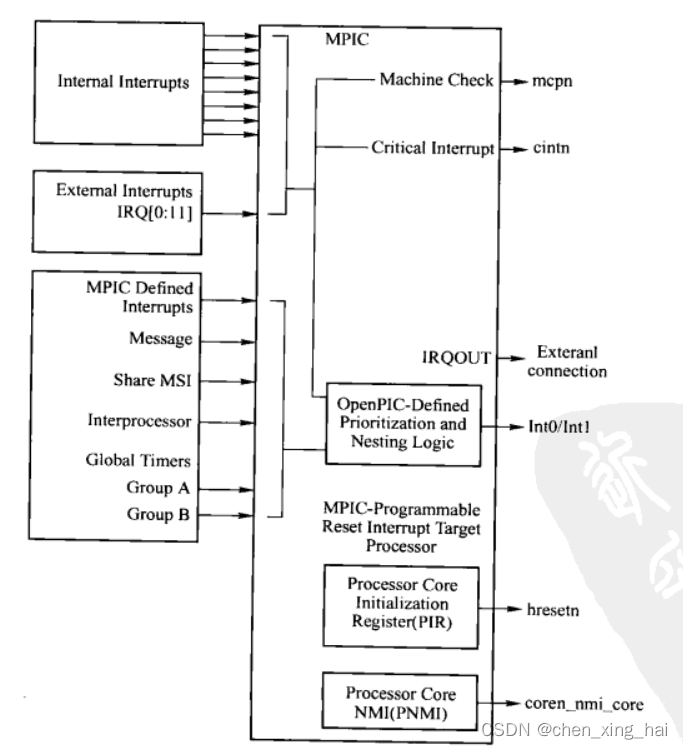 PowerPC处理器使用OpenPIC 中断控制器或者MPIC中断控制器,处理外部中断请求。其中MPIC中断控制器基于OpenPIC中断控制器,但是做出了许多增强,目前 Freescale 新推出的PowerPC处理器,其中断控制器多与MPIC兼容。