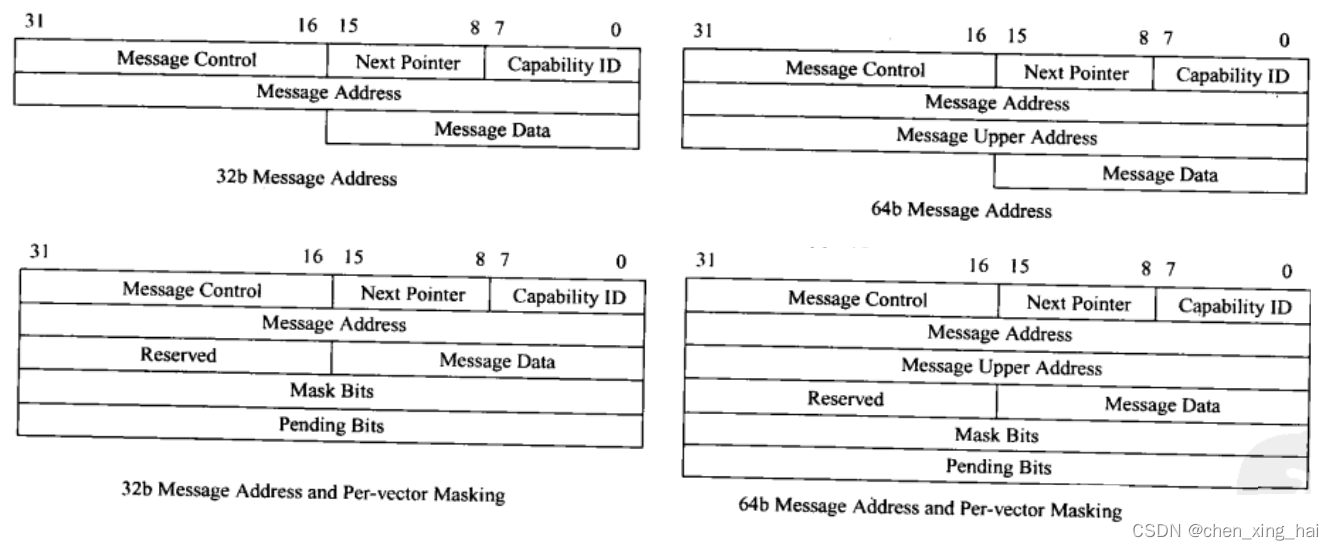MSI Capability 结构共有四种组成方式,分别是32和64位的Message结构,32位和64位带中断Masking的结构。MSI报文可以使用32位地址或者64位地址,而且可以使用Masking 机制使能或者禁止某个中断源。MSI Capability 寄存器的结构如图所示。