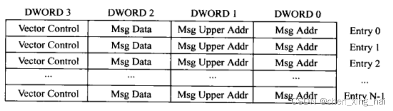 由该图可见,MSI-X Table由多个Entry组成,其中每个Entry与一个中断请求对应。每个Entry中有四个参数,其含义如下所示。