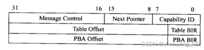 Table BIR (BAR Indicator Register):存放MSI-X Table所在的位置,PCIe总线 规范规定 MSI-X Table存放在设备的BAR空间中。该字段表示设备使用BARO~5寄存器中的哪个空间存放MSI-X table。该字段由三位组成,其中0b000~0b101与BARO~5空间一一对应。
