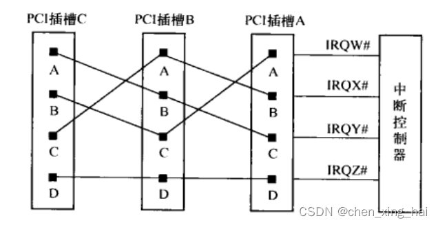 假设在一个处理器系统中,共有3个PCI插槽(分别为PCI插槽A、B和C),这些PCI插槽与中断控制器的IRQ_PINx引脚(分别为IRQW#、IRQX#、IRQY#和IRQZ#)可以按照 下图所示的拓扑结构进行连接。