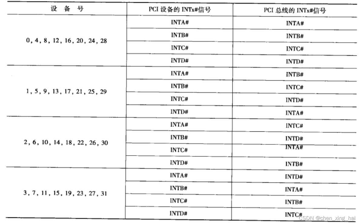 该表含义如下,在PCI桥下游总线上的PCI设备,如果其设备号为0,那么这个设备的INTA#引脚将和PCI总线的INTA#引脚相连;如果其设备号为1,其INTA#引脚将和PCI总线的INTB#引脚相连;如果其设备号为2,其INTA#引脚将和PCI总线的INTC#引脚相连;如果其设备号为3,其INTA#引脚将和PCI总线的INTD#引脚相连。