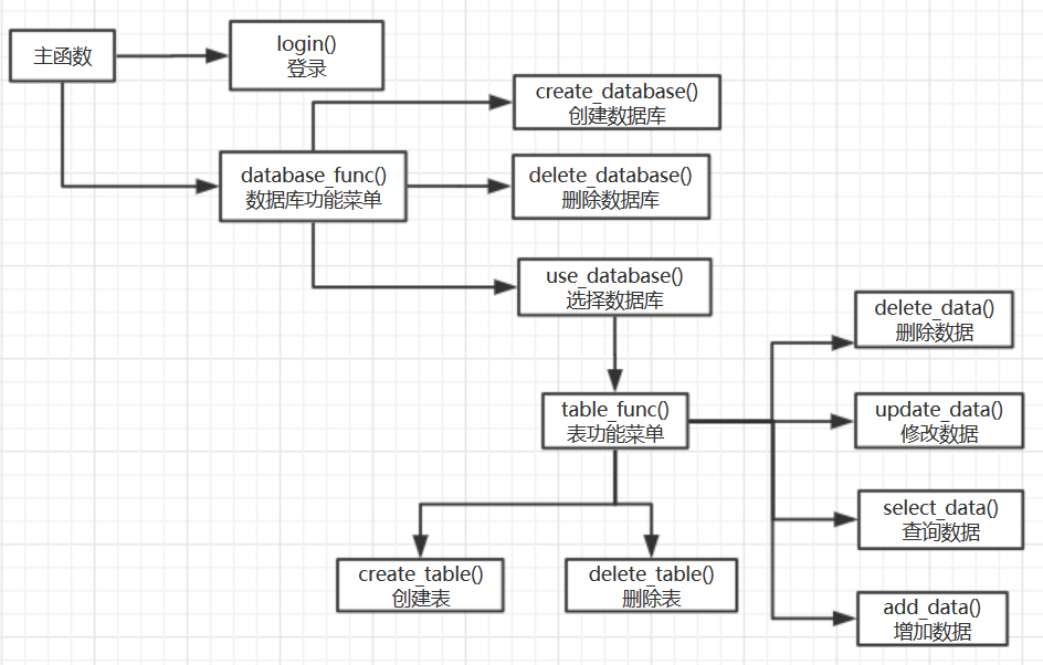 }//第三层调用,父函数为use_databaseint table_func(char * db_url){//表操作菜单system("cls");int flag=0,func=0;char db_name[10]={0};//有些库名可以显示全,有些就被阉割了一些strcpy(db_name,strtok(db_url,".txt"));printf("%s库\n",db_name);printf("============\n");printf(" 1.创建表\n 2.删除表\n 3.增加信息\n 4.删除信息\n 5.修改信息\n 6.查询信息\n 7.退出程序\n");printf("============\n");printf("请输入需要使用的功能:");scanf("%d",&func);switch(func){case 1:while(create_table(db_url));break;//创建表case 2:while(delete_table(db_url));break;//删除表case 3:while(select_data(db_url));break;//查询数据case 4:while(add_data(db_url));break;//创建数据case 5:while(delete_data(db_url));break;//删除数据case 6:while(update_data(db_url));break;//修改数据case 7:exit(0);break;}//使用功能后,判断是否继续使用system("cls");printf("你有以下两个选择\n");printf("=================\n");printf(" 1.继续使用\n 2.退出库\n 3.退出程序\n");printf("=================\n");printf("请输入你的选择:");scanf("%d",&flag);if(flag==1){//继续使用return 1;}if(flag==2){//退出return 0;}if(flag==3){exit(0);}return 0;