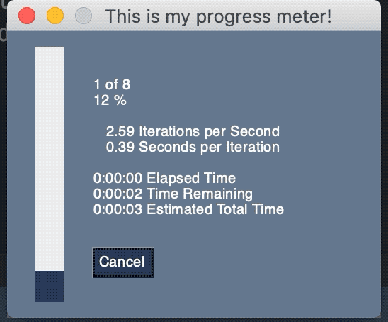 for i, item in enumerate(mylist):sg.one_line_progress_meter('This is my progress meter!', i+1, len(mylist), '-key-')time.sleep(1)