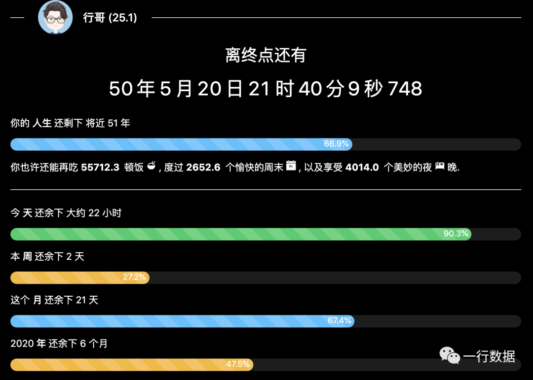 之前行哥给大家推荐过一个windows神器,里面有个小功能是人生进度条,可以看到2020年的进度只剩下一半,那么你的代码进度还剩多少呢?