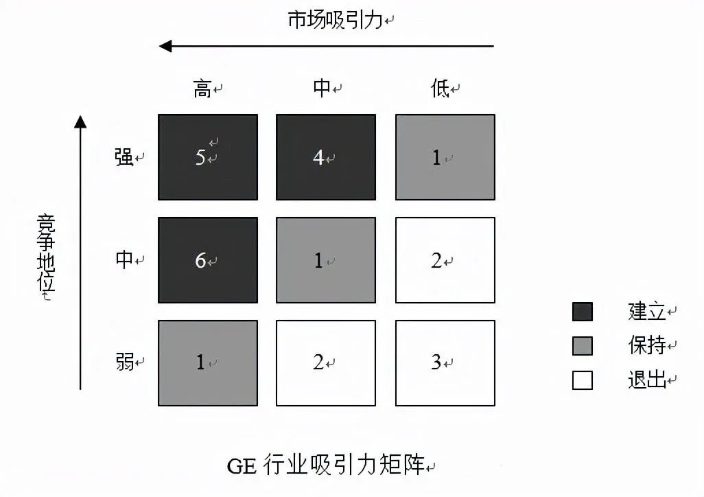 这个模型是通用公司和麦肯锡公司所使用的三三矩阵。这个矩阵的两个轴分别表示市场吸引力和业务单位的实力或竞争地位。一个特定的业务单位处于矩阵中何处是通过对这个特定的业务单位和行业分析加以确定的。通过对这两个变量进行打分,确定业务单位位于矩阵中的位置,并由此来确定对该业务单位所采取的策略。
