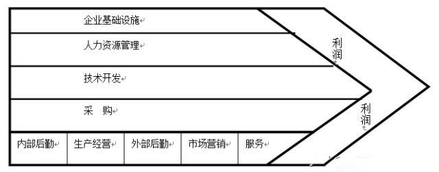 价值链列示了总价值、并且包括价值活动和利润。价值活动是企业所从事的物质上和技术上的界限分明的各项活动,这些活动是企业创造对买方有价值的产品的基石。利润是总价值与从事各种价值活动的总成本之差。价值活动分为两大类:基本活动和辅助活动。基本活动是涉及产品的物质创造及其销售、转移买方和售后服务的各种活动。辅助活动是辅助基本活动,并通过提供采购投入、技术、人力资源以及各种公司范围的职能支持基本活动。
