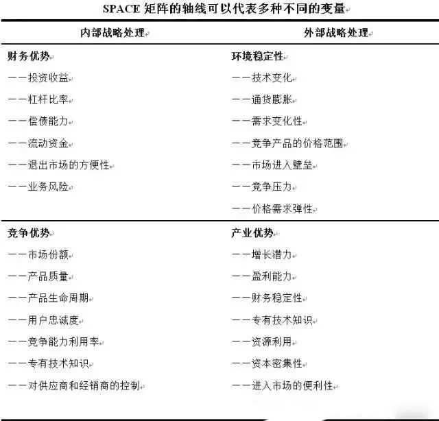 SPACE矩阵有四个象限分别表示企业采取的进取、保守、防御和竞争四种战略模式。这个矩阵的两个数轴分别代表了企业的两个内部因素——财务优势(FS)和竞争优势(CA);两个外部因素——环境稳定性(ES)和产业优势(IS)。
