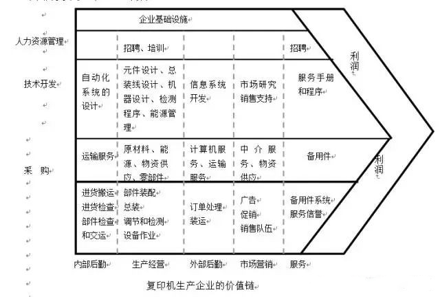 价值链的框架是将链条从基础材料到最终用户分解为独立工序,以理解成本行为和差异来源。通过分析每道工序系统的成本、收入和价值,业务部门可以获得成本差异、累计优势。下图为复印机生产企业的价值链。