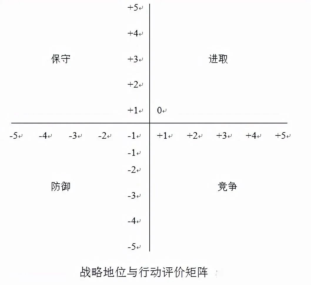 向量出现在SPACE矩阵的进取象限时,说明该企业正处于一种绝佳的地位,即可以利用自己的内部优势和外部机会选择自己的战略模式,如市场渗透、市场开发、产品开发、后向一体化、前向一体化、横向一体化、混合式多元化经营等。