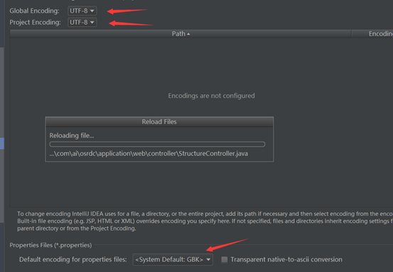 Editor >> File Encodings, 可以对Global Encoding、Project Encoding、PropertiesFiles 编码进行设置,如下:
