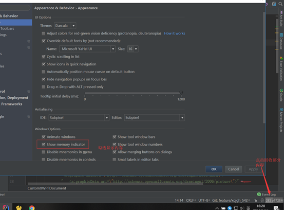 如图所示,IDEA 默认是不显示内存使用情况的,对于大内存的机器来讲不显示也无所谓,但是如果是内存小的机器最好还是显示下。点击后可以进行部分内存的回收。